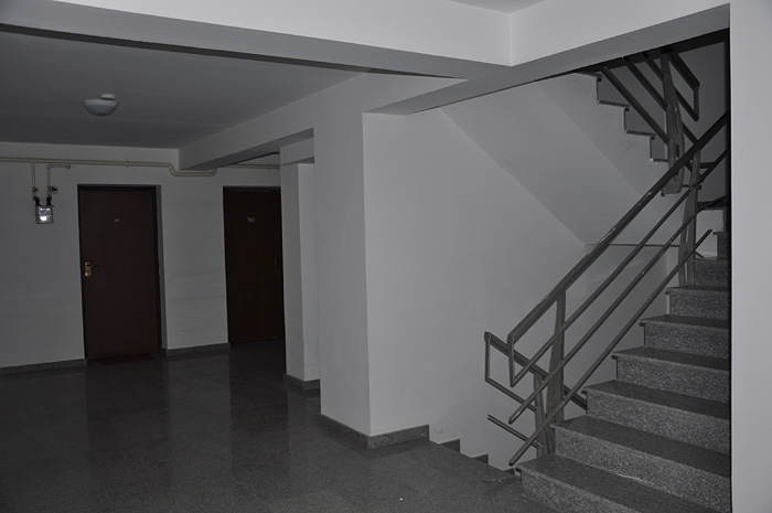 Intrarea de la parter eate realizată prin placare cu piatra naturală (tip granit sau similar), la fel şi holurile de etaj şi scările. Balustradele scărilor sunt din profile de inox.